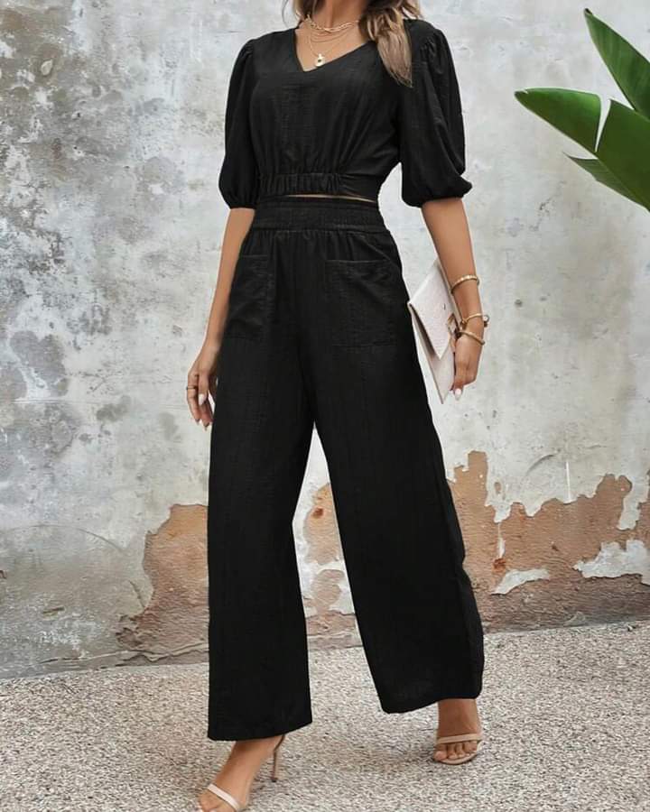 Conjunto crop top y pantalon ancho negro, crop top de manga farol con escote en V y pantalon de pierna ancha