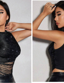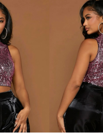 Blusa con panel de lentejuelas y cuello simulado recortado en el pecho