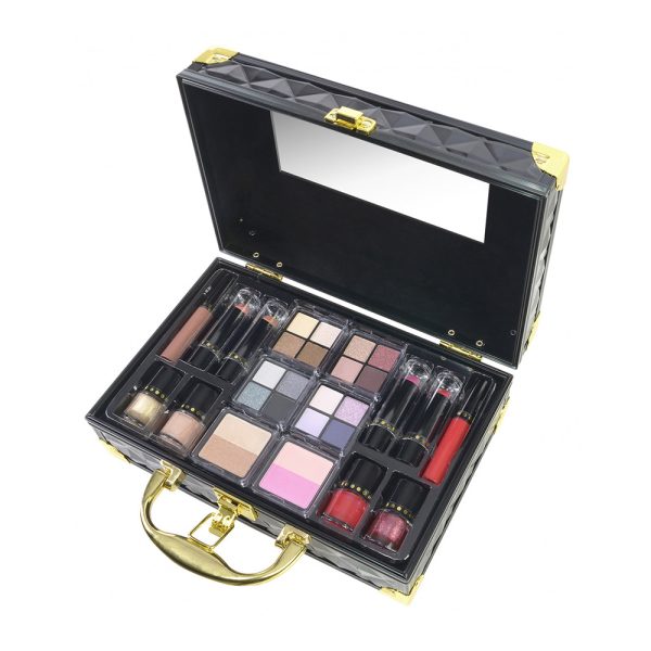 1 Maletín, 4 paletas de sombras de ojos con 4 tonalidades, 4 esmaltes de uñas con 4 tonos diferentes, 4 Barras de labios, 2 LipGloss, 1 paleta con iluminador 2 tonos, 1 paleta con blush en 2 tonos. Un maletín refinado con tono negro a juego con dorado. Diferente a todo lo demás y con un estilo propio. Cuenta con un surtido amplio de Maquillaje completo para llevar tu propio look. No te olvides que podrás guardar otras muchas cosas y salir con el en cualquier momento del día.