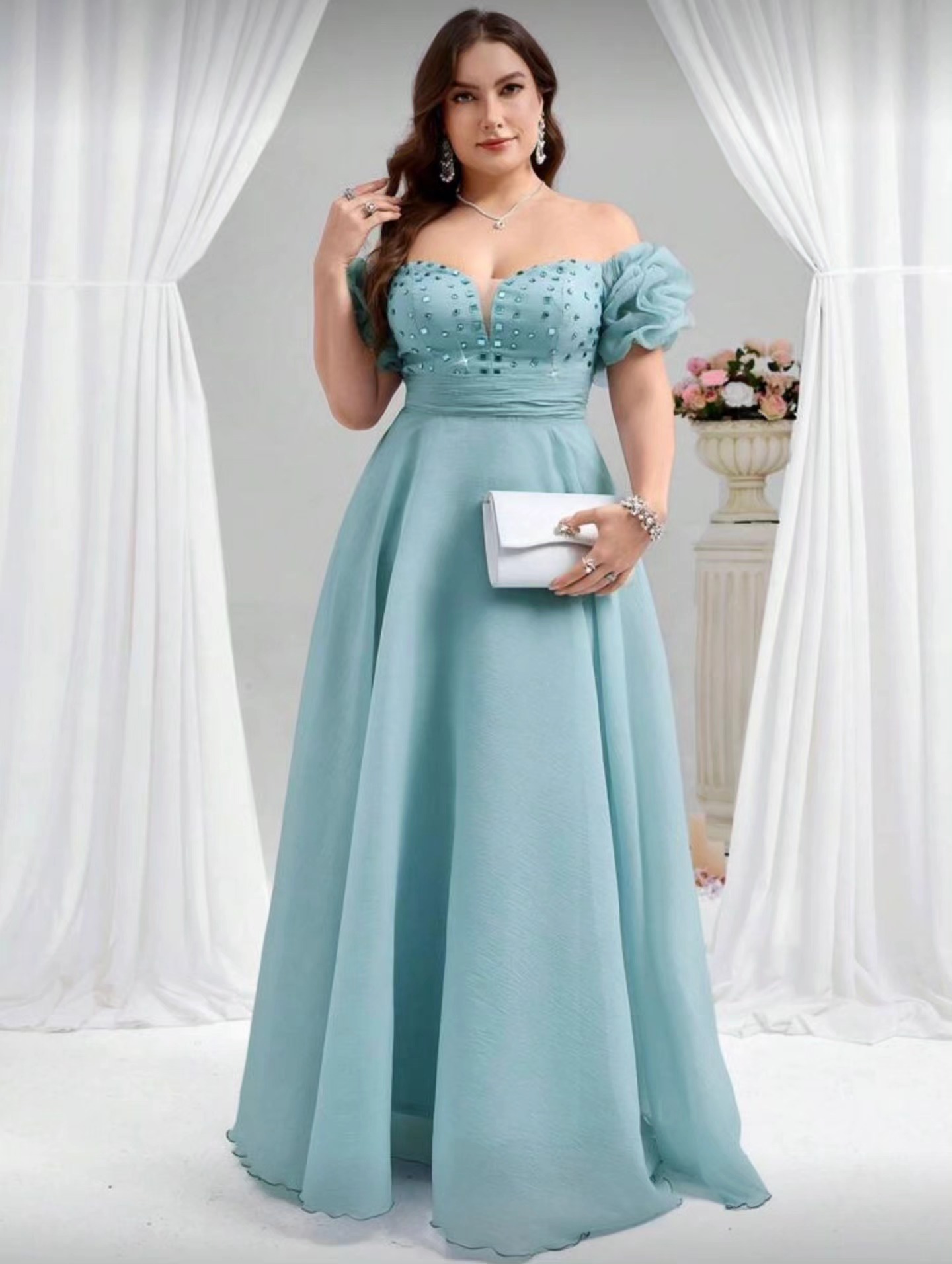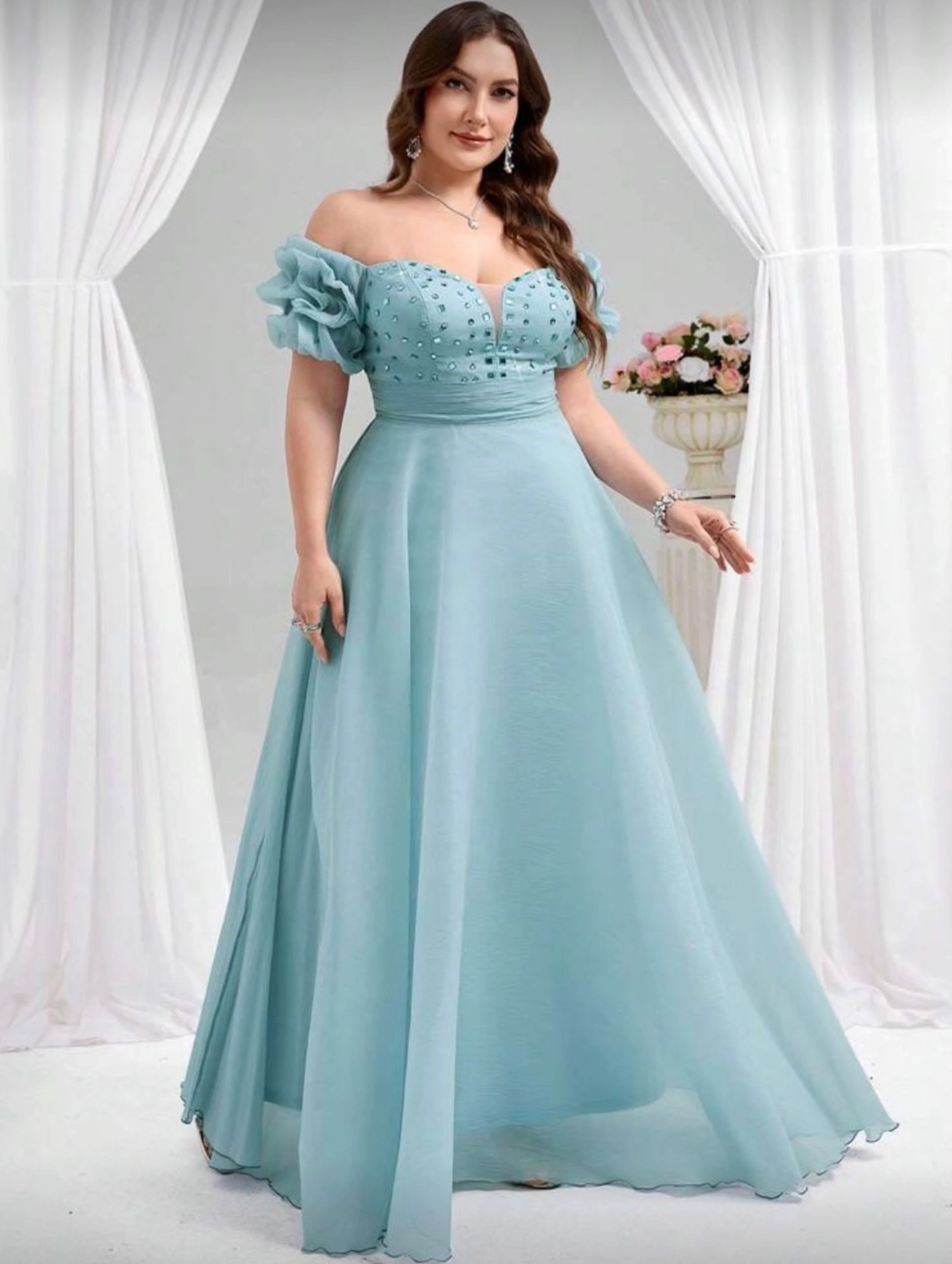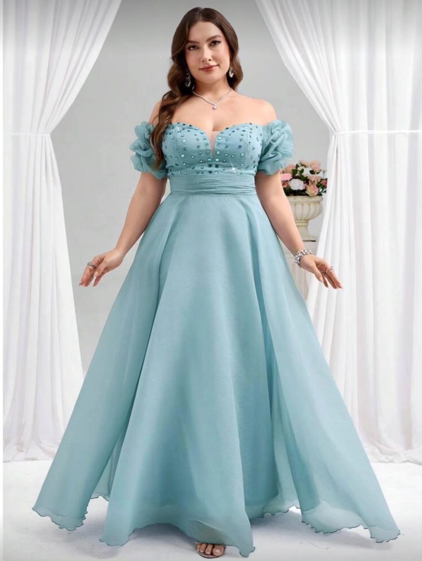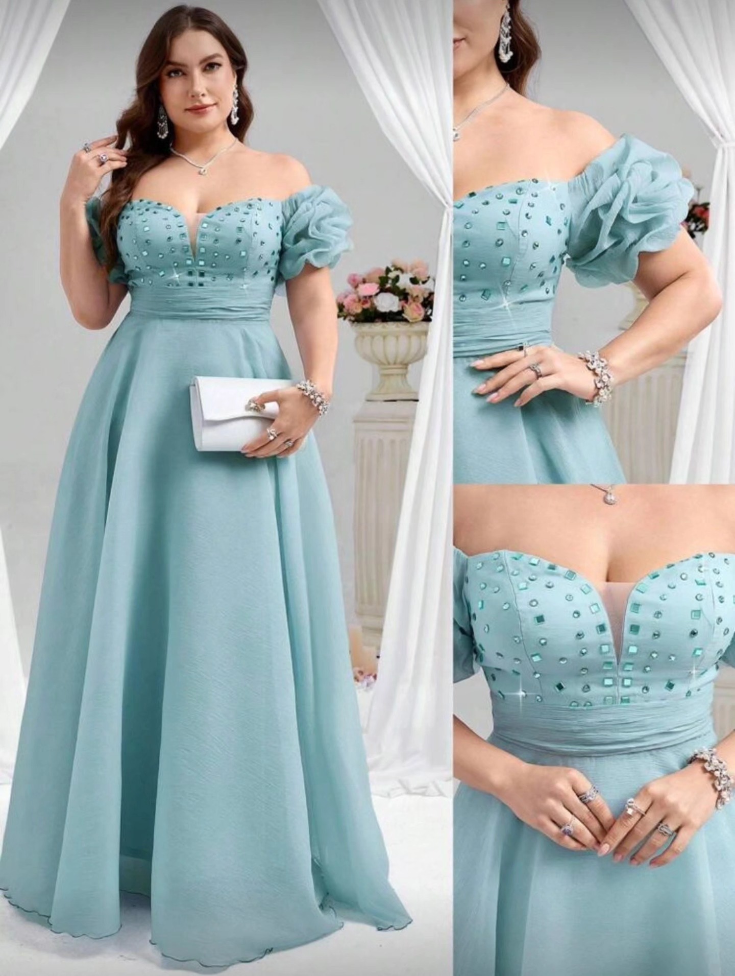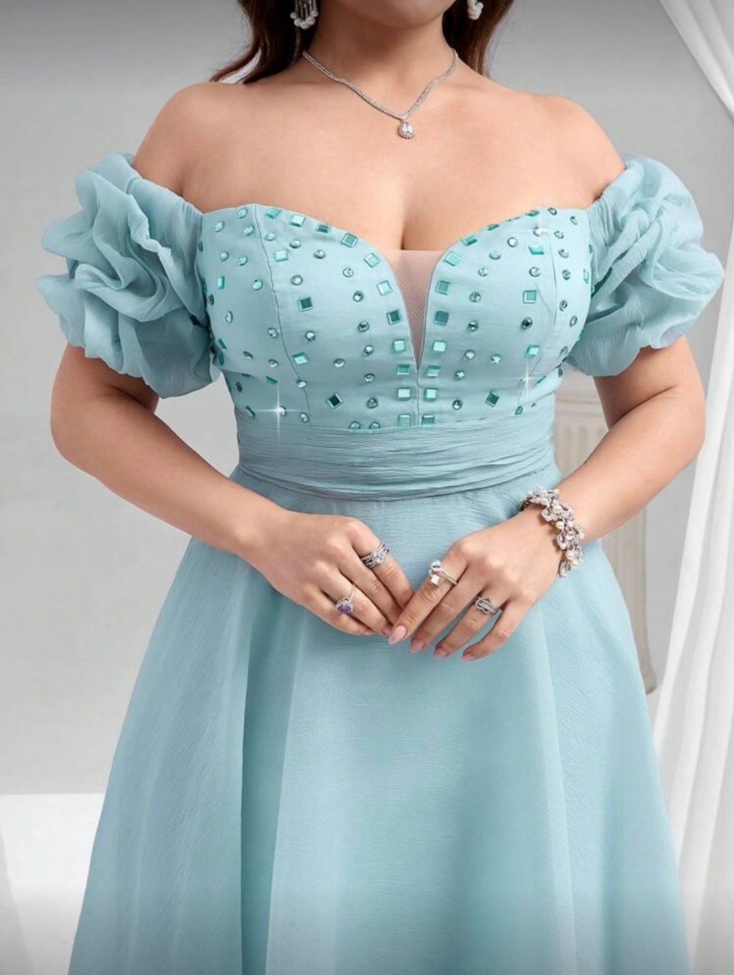Vestido de fiesta de vuelo con hombros caídos, cuello en V profundo con strass, manga corta abullonada y plisada. Apropiado para fiesta de cumpleaños, ceremonia de graduación, cena navideña.