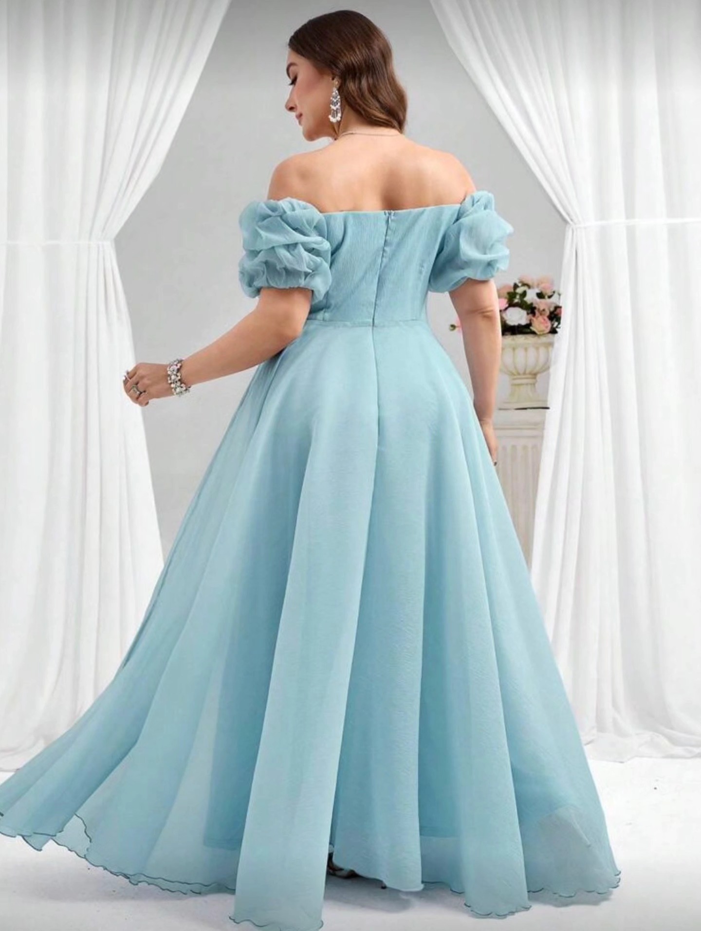 VESTIDO CUELLO EN V CON HOMBROS CAIDOS COLOR CIELO