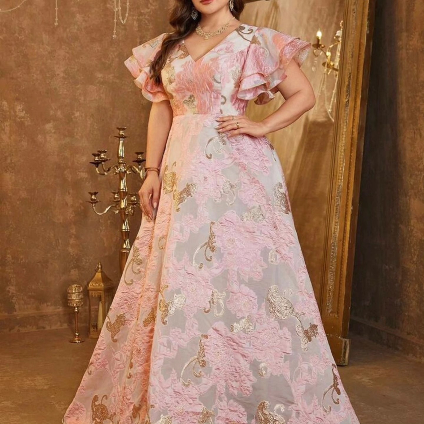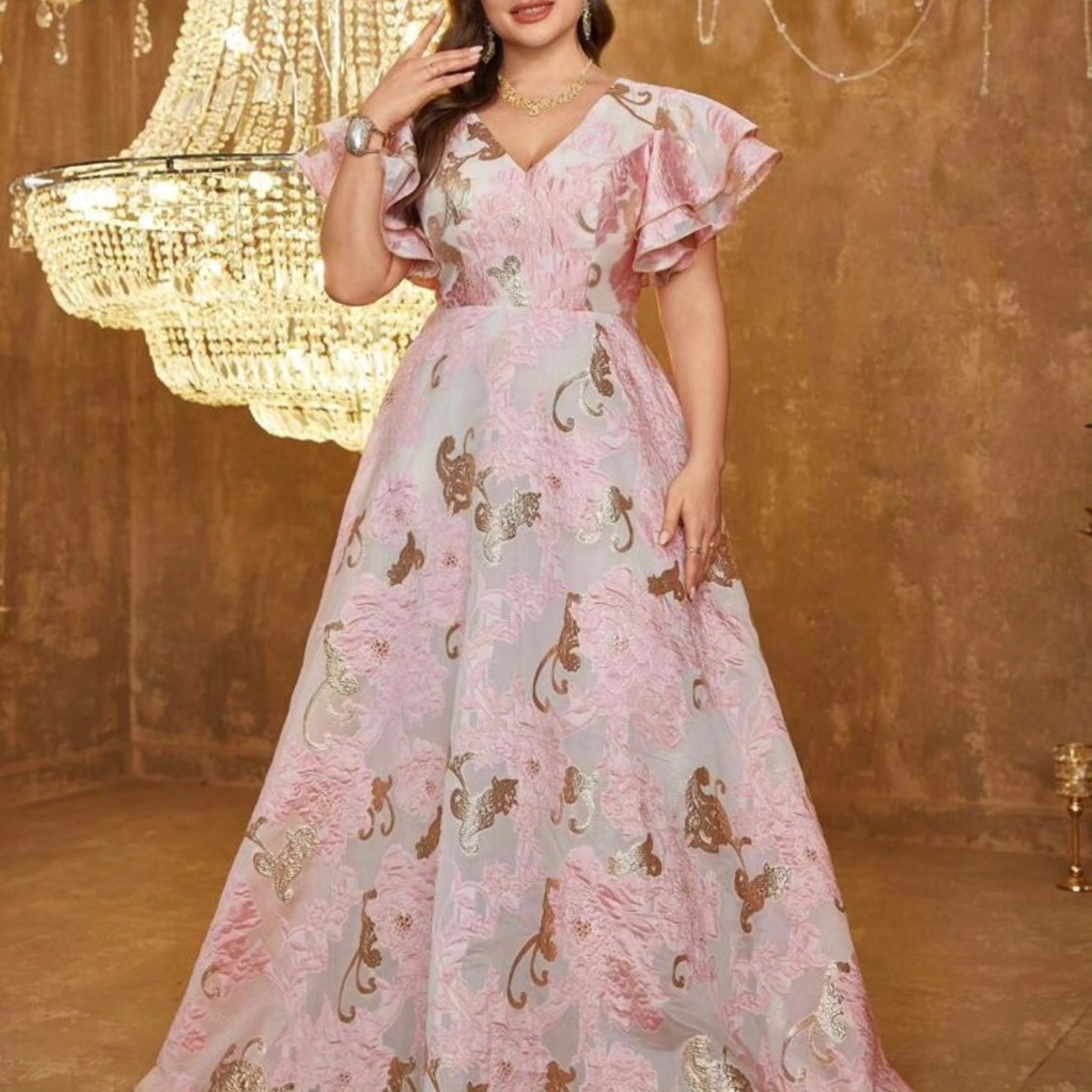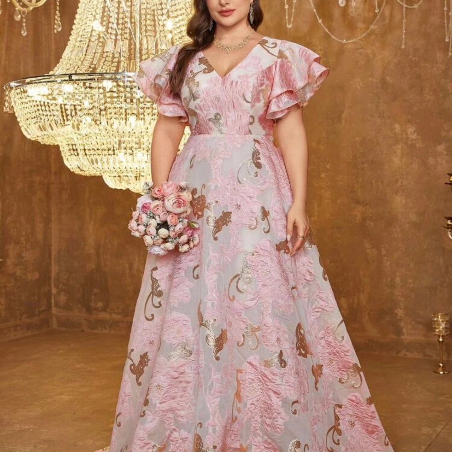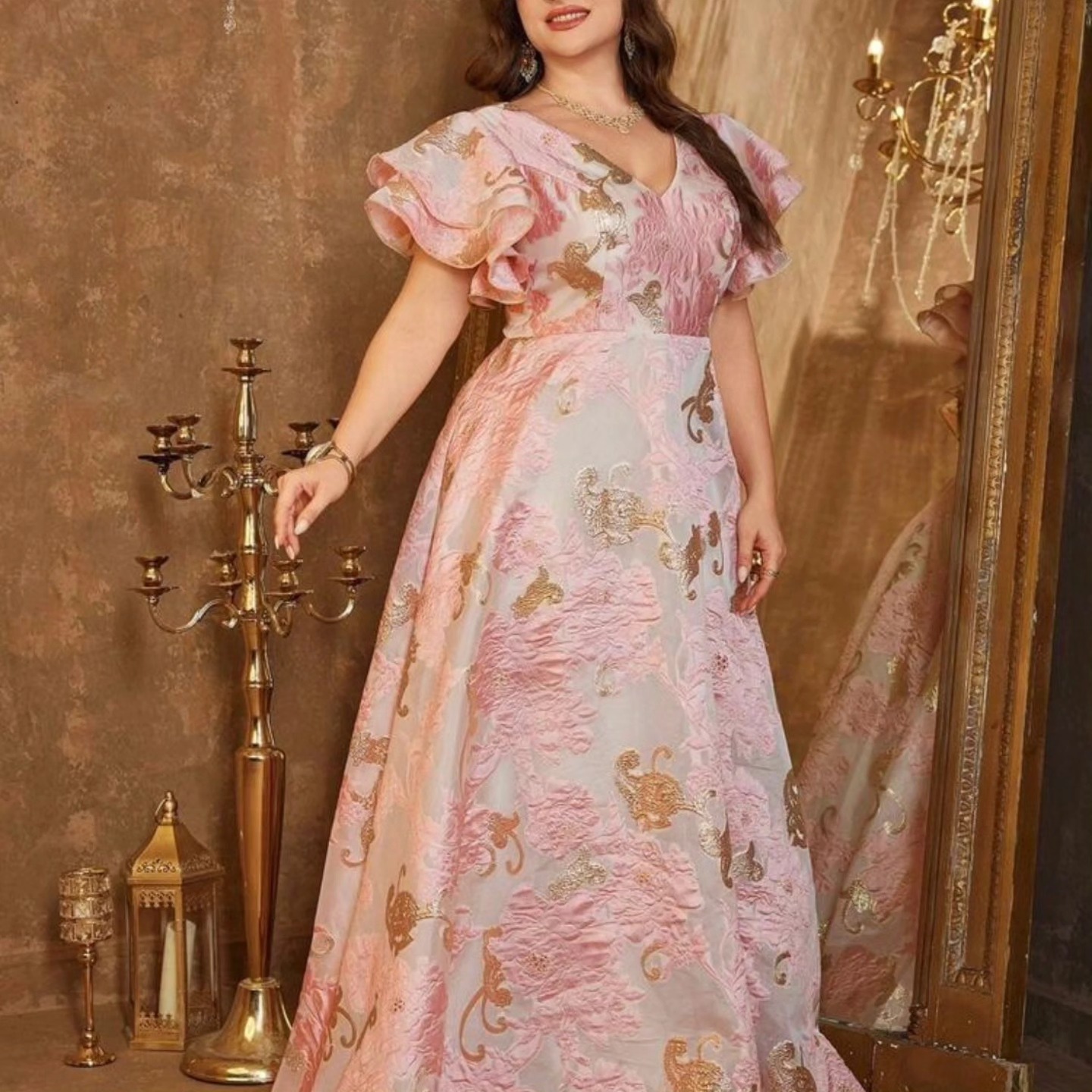 Vestido formal con cuello en V, mangas con volantes y bordado para mujer talla grande, vestido de fiesta de noche. Talla XL.