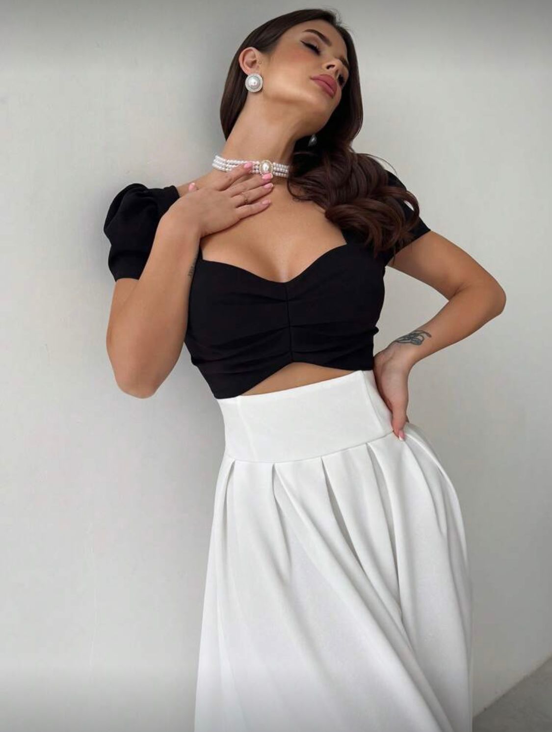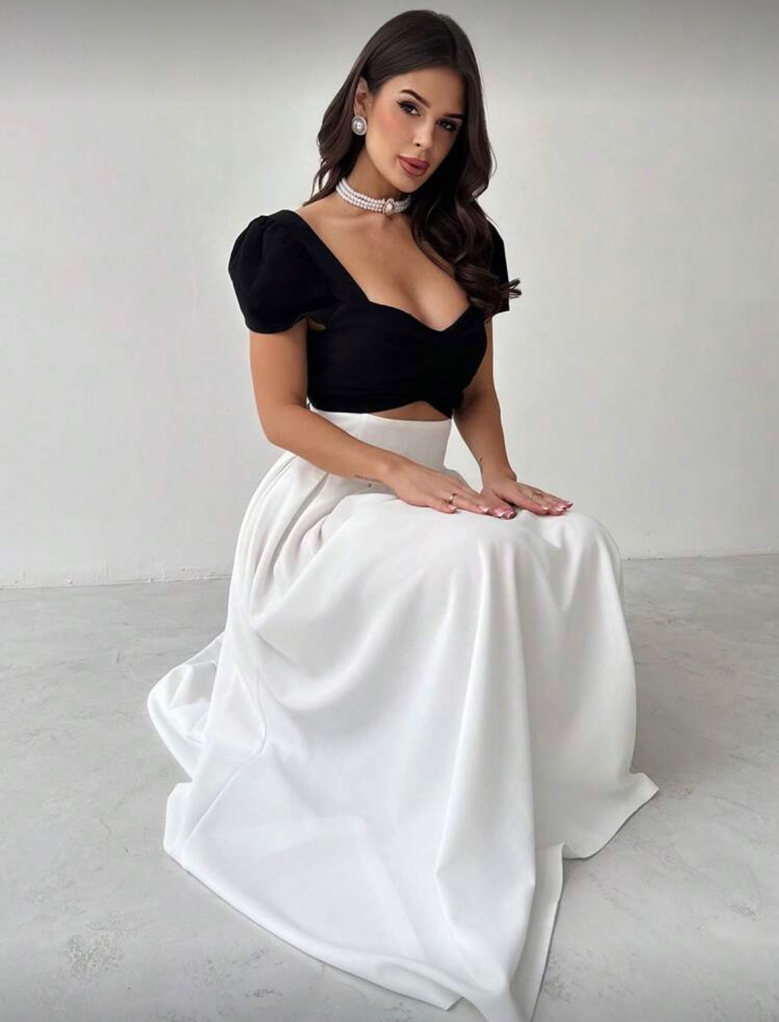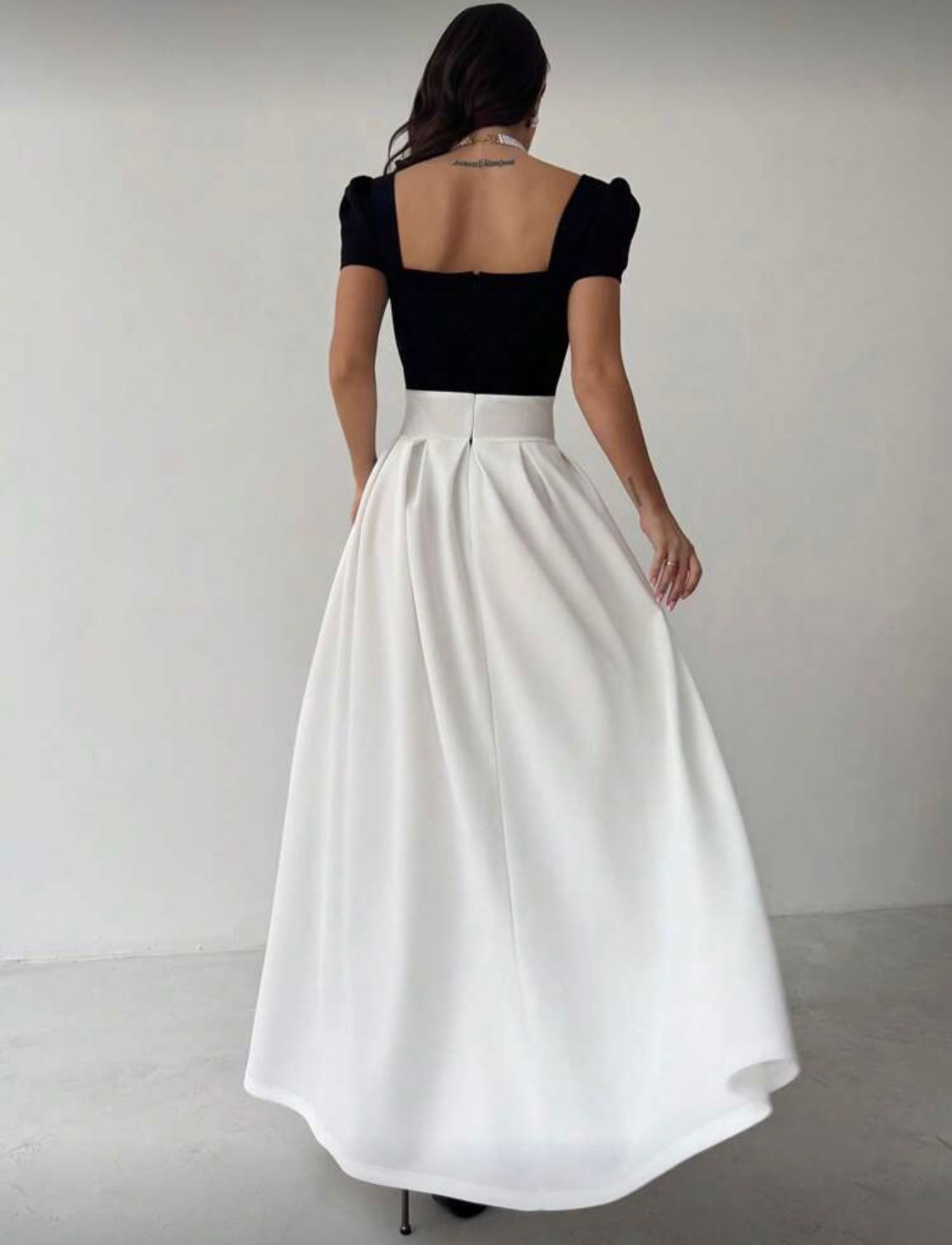 Vestido de línea A con cintura alta, cuello de corazón, mangas abullonadas, contraste blanco y negro, elegante, exquisito, romántico, encantador, adecuado para uso diario, viajes, fiestas, bodas . Color Blanco y Negro. Talla S.
