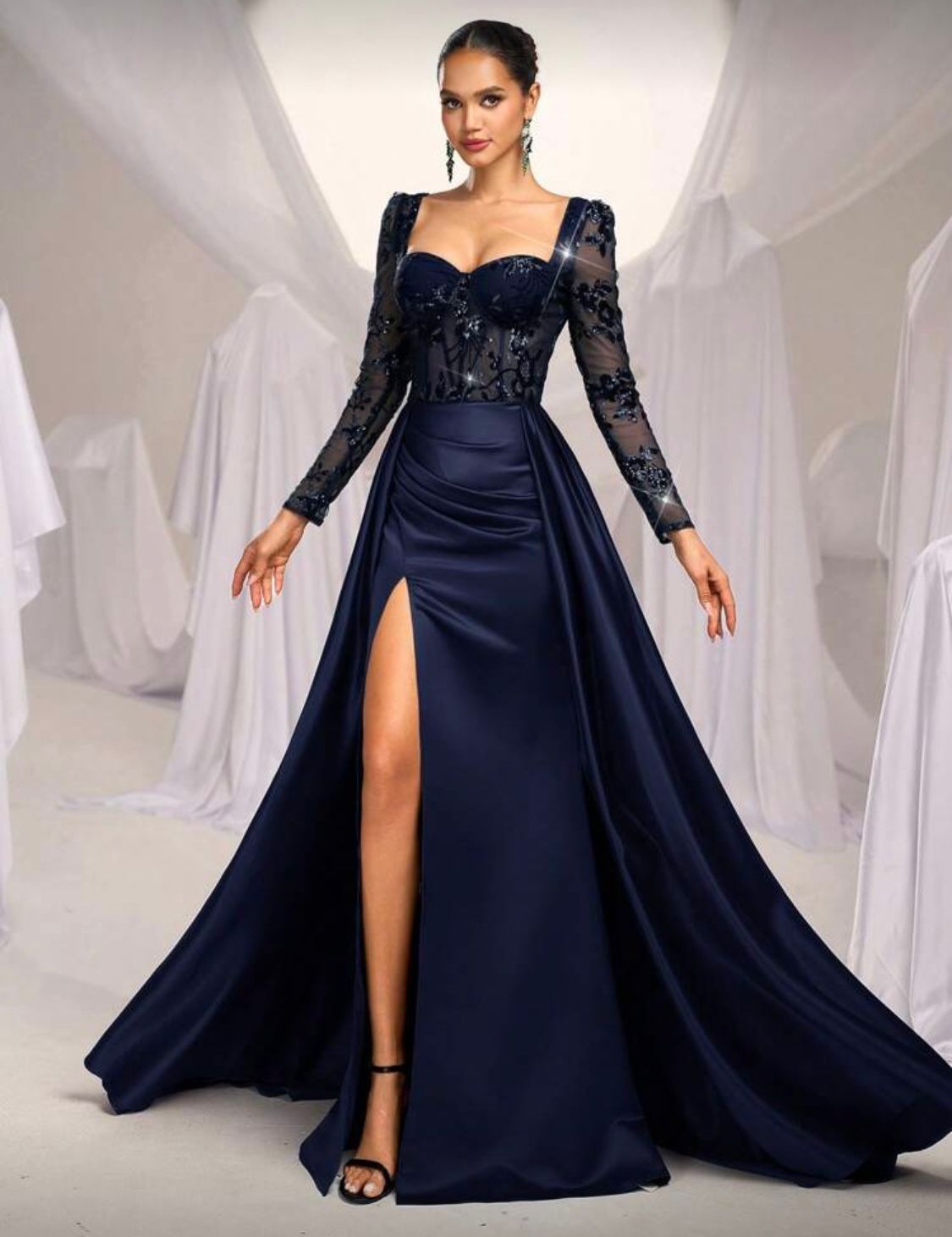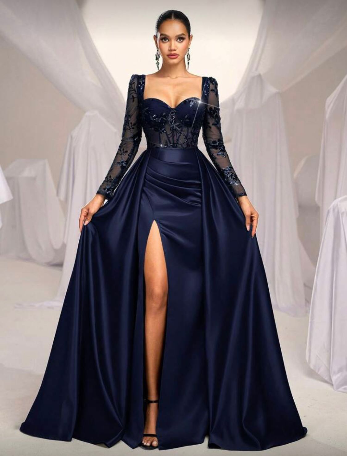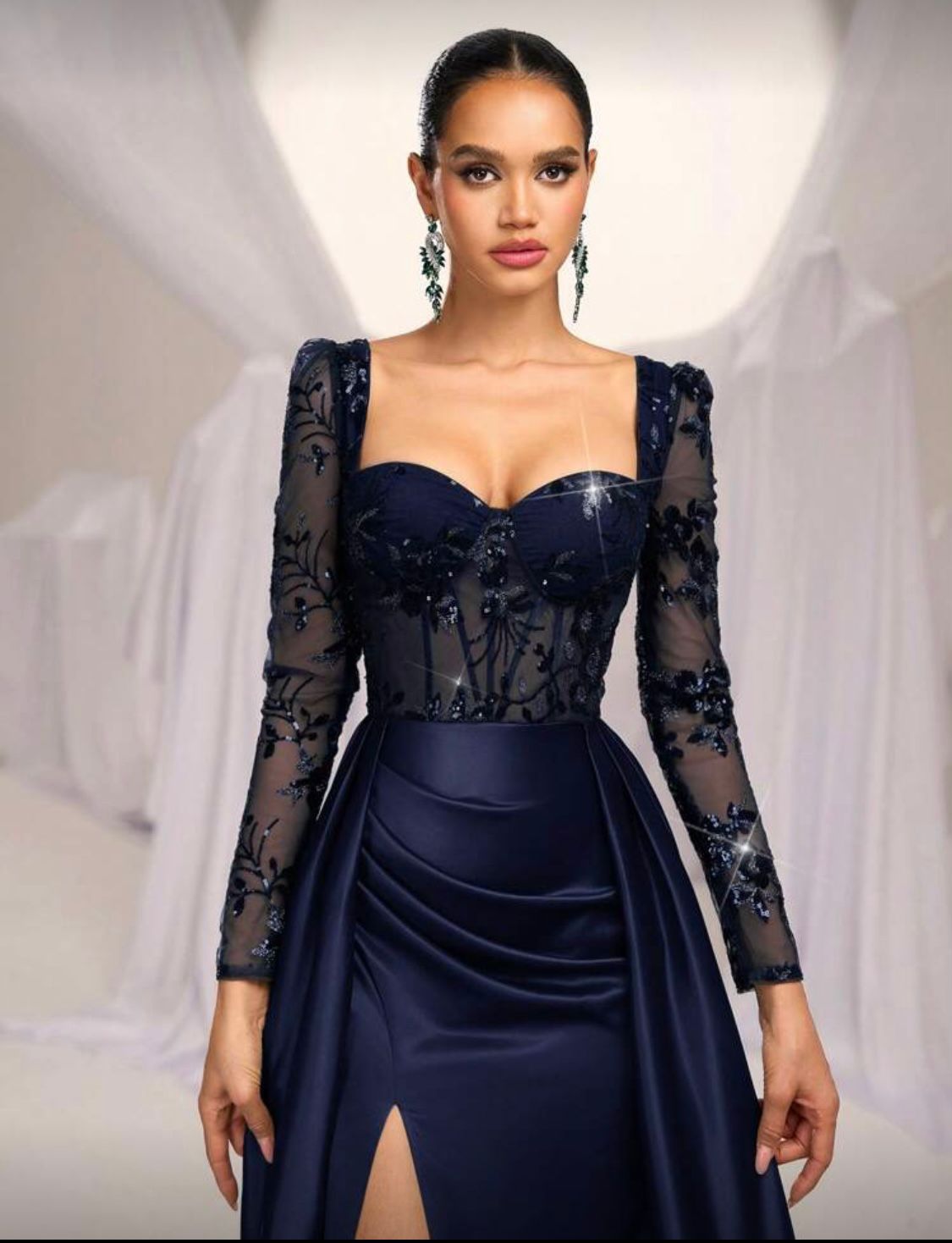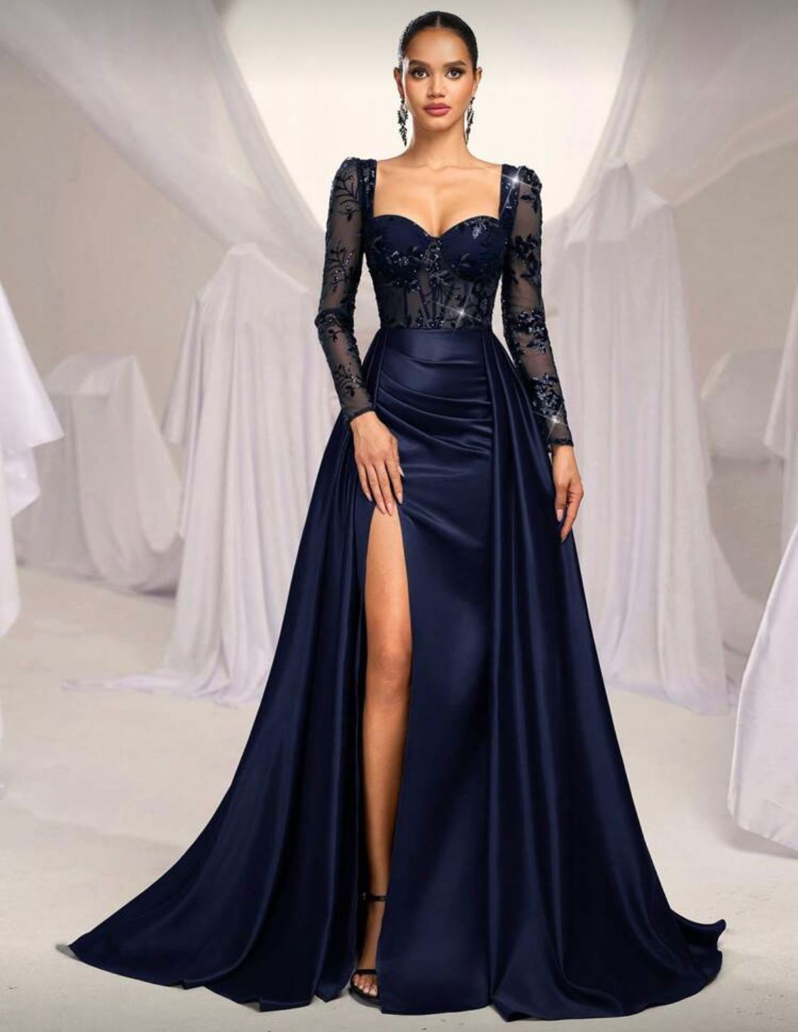 Vestido de novia de talla grande con manga transparente en azul marino, parches, cuentas, abertura alta y ornamentación pesada para fiestas de noche, vestido de gala de manga larga para invitados de boda, graduación, cena. Talla XL.