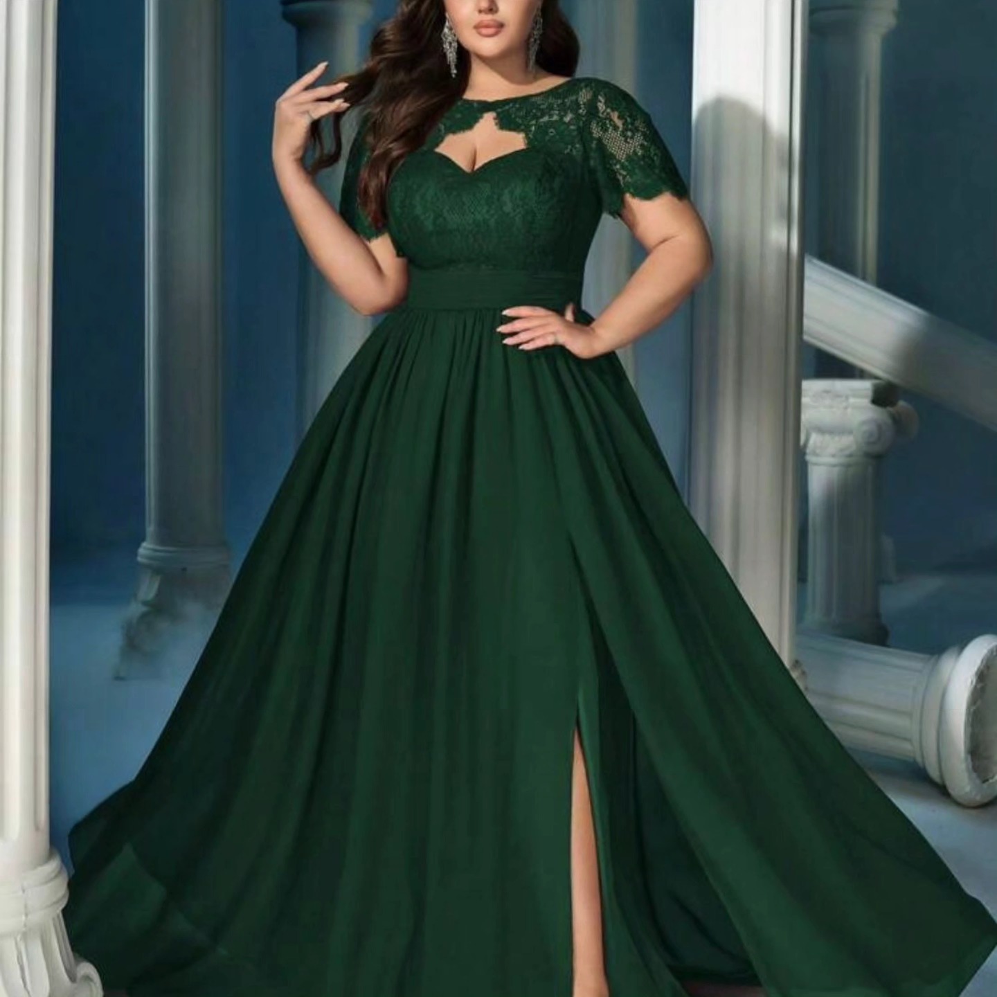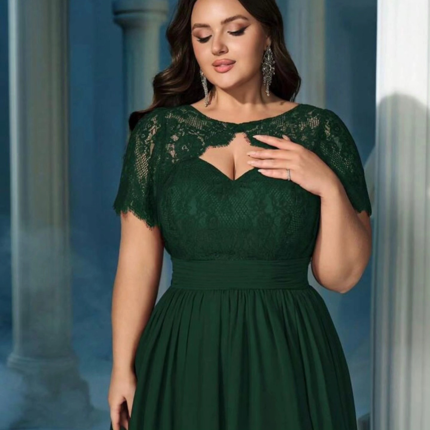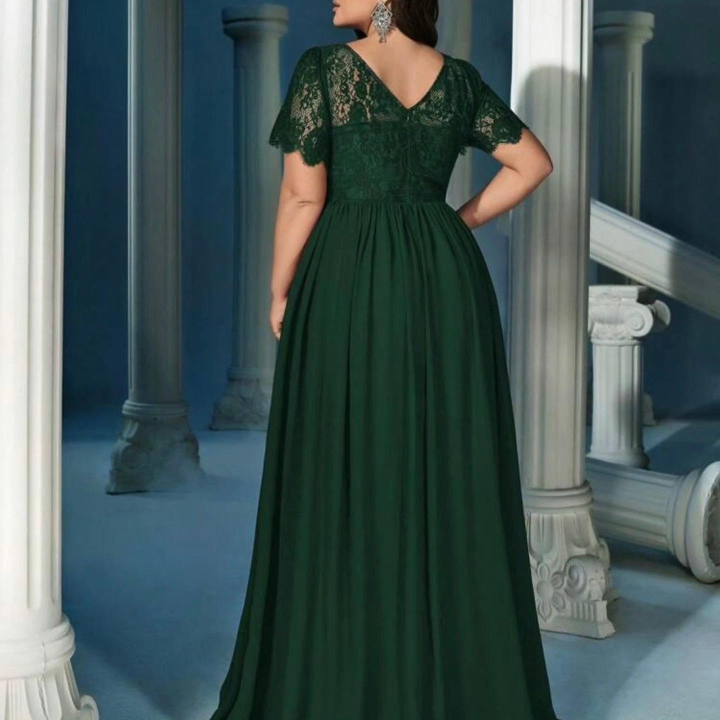 Vestido elegante de manga corta con encaje y parches en talla grande color verde para banquete. Talla 1XL .Color Verde.