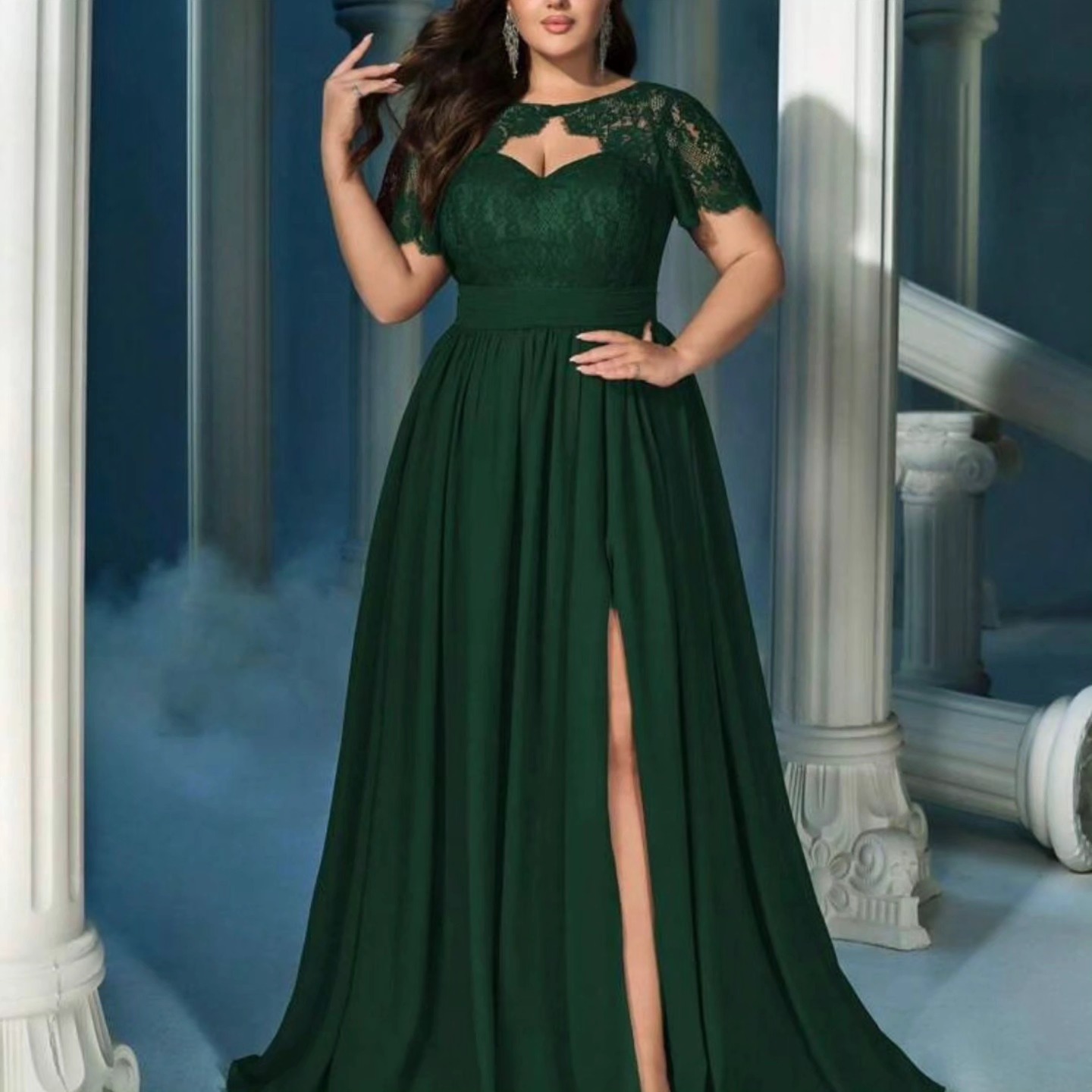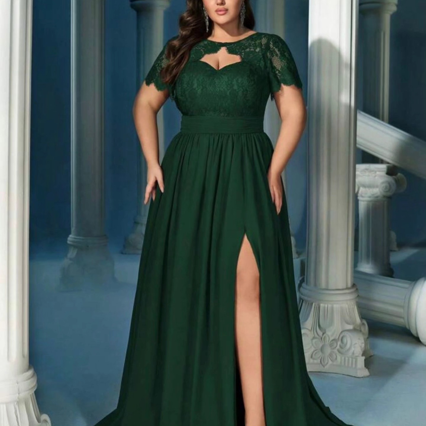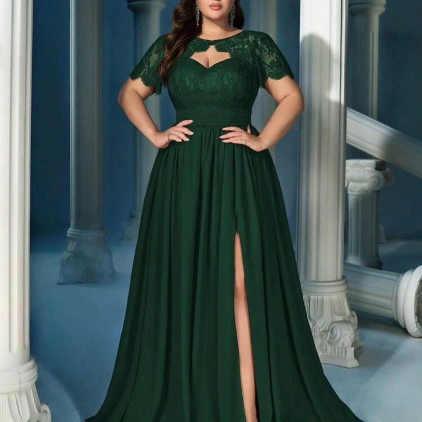 Vestido elegante de manga corta con encaje y parches en talla grande color verde para banquete. Talla 1XL .Color Verde.