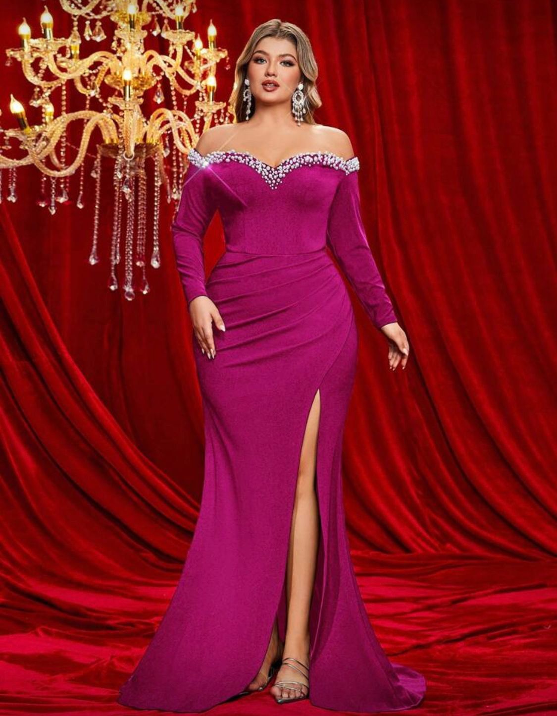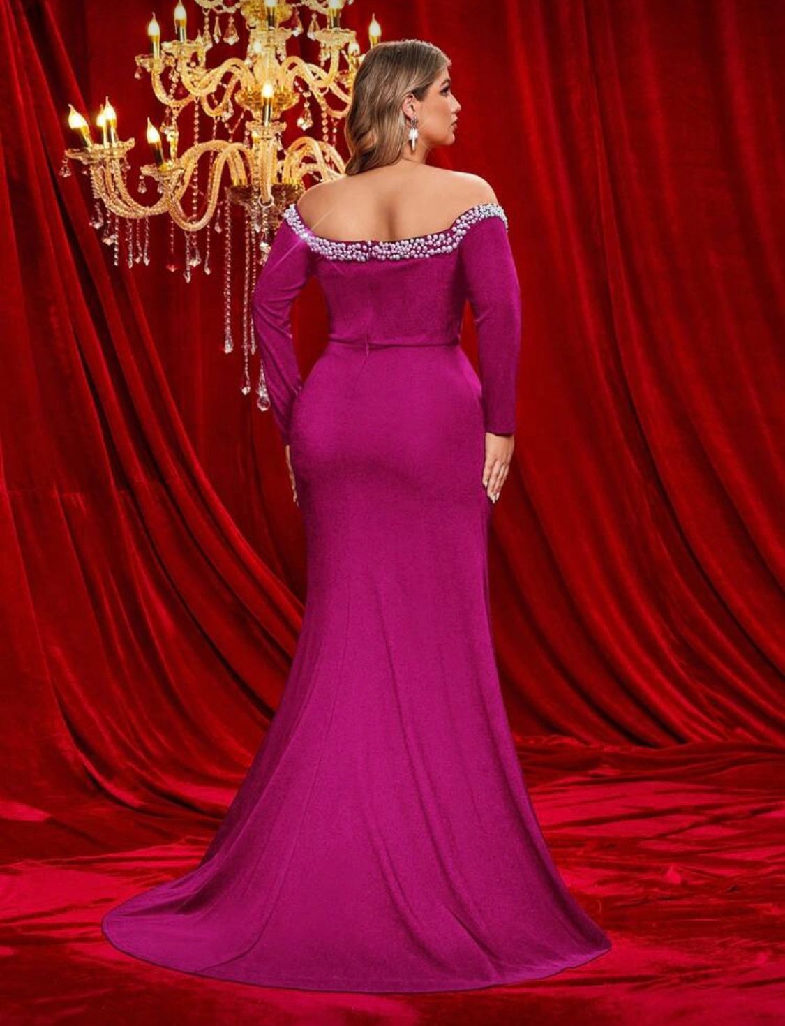 Vestido elegante y lujoso de talla grande, de punto elástico, con hombros descubiertos, bordado de perlas falsas, mangas largas ajustadas, corte sirena hasta el suelo, adecuado para invitados de boda, fiesta, vacaciones, baile de graduación, ocasión formal. Talla Xl. Color Fucsia.