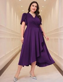 Vestido elegante de talla grande de unicolor con mangas de pétalos y envolvente. Color morado. Talla 2Xl